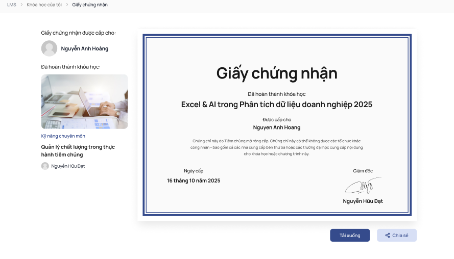 Tự động hóa việc cấp chứng chỉ sau khi hoàn thành khóa học hoặc chương trình. Những chứng chỉ này có thể hỗ trợ các chương trình đào tạo tuân thủ hoặc phát triển chuyên môn, gia tăng giá trị cho thành tích của người học.